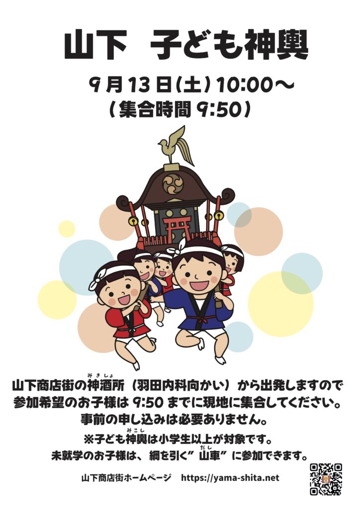 担いでくれるお友達は、9:50までに山下商店街の神酒所へ集まってください。