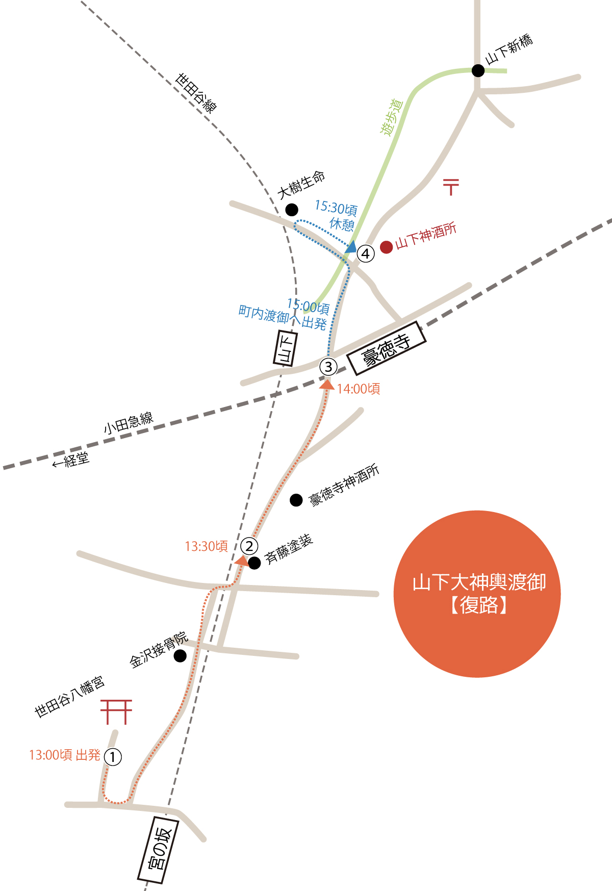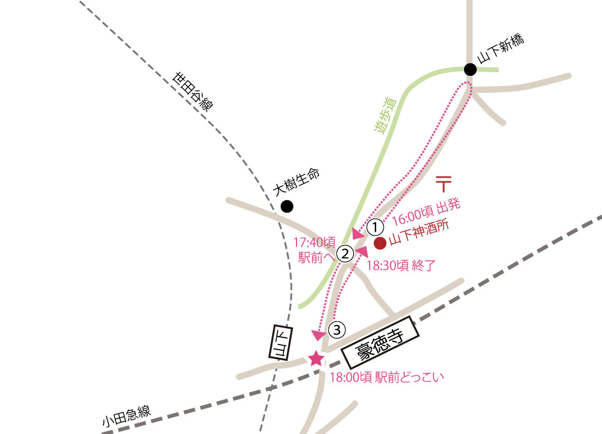 世田谷八幡宮と山下商店街の神酒所の場所は以下をご参照ください。